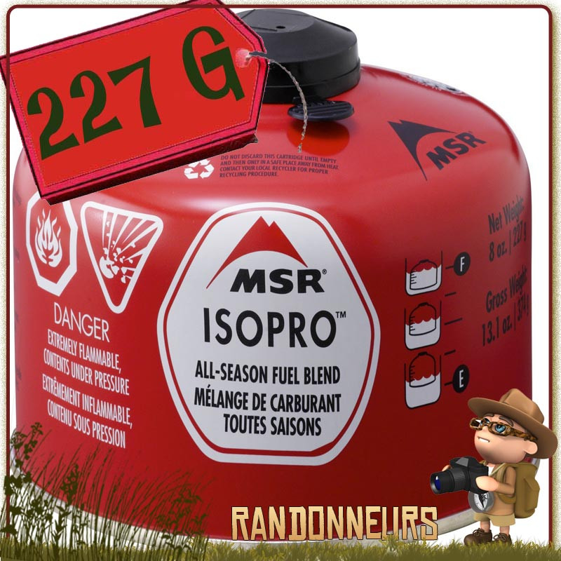 Cartouche Gaz IsoPro 227g MSR- Le gaz IsoPro de MSR, conditionné en cartouche à valve Lindal avec filetage, est un mélange de gaz composé de 80% d'isobutane et 20% de propane. Cette formulation spécifique assure une utilisation 4 saisons, même à basses températures, idéal pour vos randonnées et treks en montagne