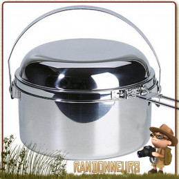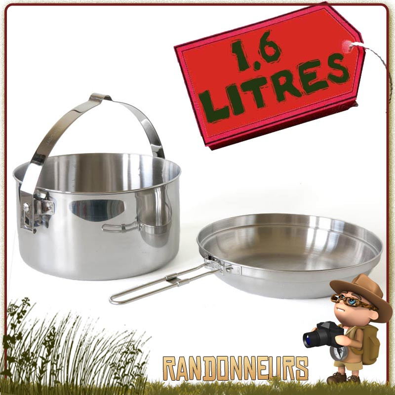 Set Popote Camping Inox 2 Personnes Highlander - Ensemble complet de Popote Acier Inox pour la randonnée et le camping, pour deux personnes. Set Popote Inox avec deux casseroles, deux couvercles (dont un en poele), deux assiettes et deux tasses. Robuste et compacte, popote inox idéale pour votre sac à dos randonnée